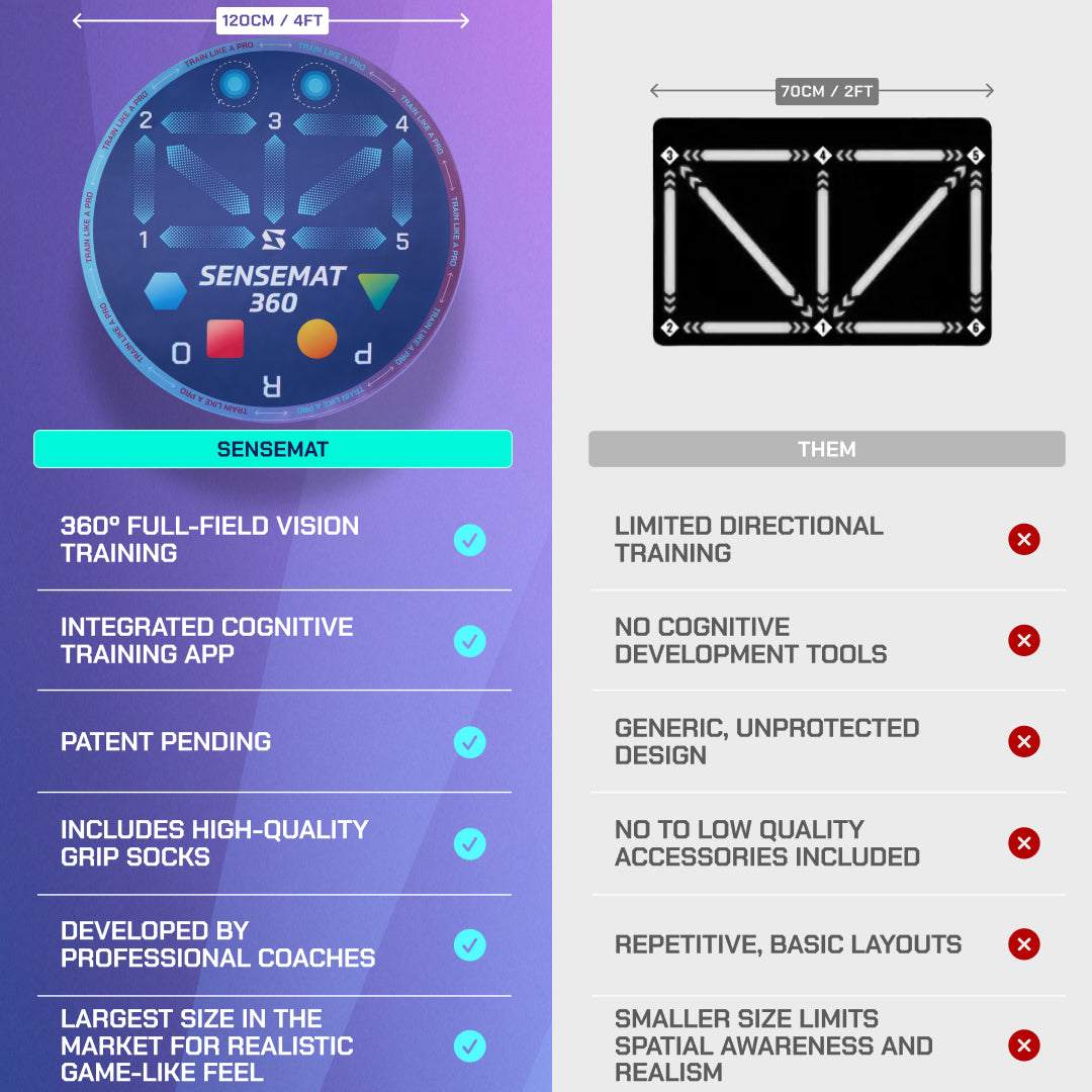 SenseMat 360 est le système complet d'entraînement technique et cognitif conçu pour booster votre jeu de jambes, votre vision et votre temps de réaction. Conçu pour la pratique en solo, les académies et le coaching à distance, il offre une conscience à 360° inégalée - aidant les joueurs à réagir sous pression et à dominer toutes les directions du jeu.